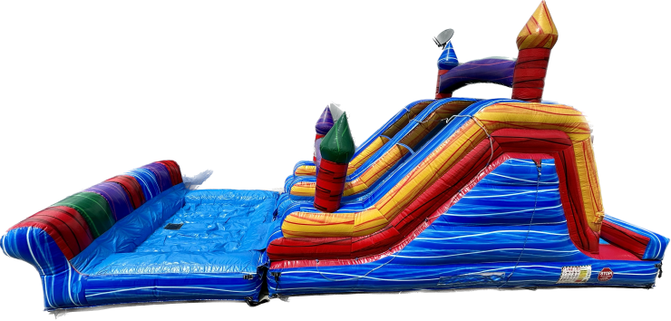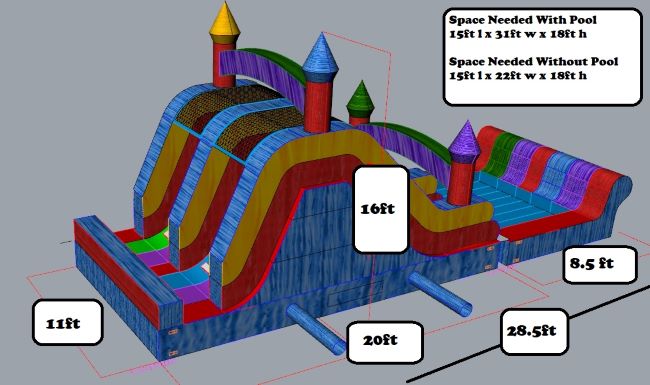 The space required is 32ft L x 15ft W x 19ft H of clearance for this slide. It's actual size is 30ft L x 12ft W x 16ft H. Safety Information: We do not recommend having more than one person on the stairs to this unit. We also do not recommend having more than one person slide down at a time. Adult supervision is needed at all times. Please make sure this item is used properly. *One 15-amp power outlet required within 50 feet. (Do not plug any other device into the same outlet) **DO NOT let kids climb up the slide, it is unsafe! *** If wind exceeds 20 MPH and/or you see the unit lifting due to wind, TURN OFF THE UNIT IMMEDIATELY! Delivery Information: To ensure proper set up, we will need to know the surface the unit will be on and if there are any stairs that need to be used to get to the site location. There is an additional charge for stairs, please call us to discuss this matter further. Items on grass will be staked down, items on artificial grass or concrete will be held down by sandbags. (Additional $15 per unit). *We do not take any units through the house* It is the customers responsibility to make sure the designated space for the unit is clear of any household items. It is also the customers responsibility to measure the designated space to confirm the unit will fit accordingly. Slides cannot be placed on uneven ground. Water Option: We provide a hose attached to the unit; it is the customers responsibility to have a hose long enough to reach the unit to make it wet. Park Delivery: Remember! We deliver to parks in Los Angeles County and Ventura County, but additional fees apply to these deliveries. Before booking your order with us, please confirm with the park: availability and permit status. All park orders require a generator. When selecting which one you will need, keep in mind that single circuit generators are for 1 unit, whereas double circuit generators can power 2. Generators are guaranteed to run for up to 5 hours. If you want to keep the item for longer periods of time, you can do so by refilling the generator or requesting an extra gas can upon delivery for an additional charge. (Customers are responsible for refilling generators on parties longer than 5 hours). Slides cannot be used wet at the park. |