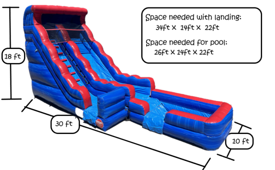 The space required is 18ft W x 35ft L x 20ft H of clearance for this slide. It's actual size is 16ft W x 30ft L x 18ft H.