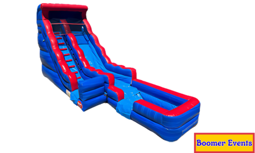This is our 18FT Blue Waterfall Slide! It can be used wet or dry! Perfect for hot summer days. It has a single lane slide decorated with fun waves, bright blue and red colors that will make your kids love this item! It's appropriate for children 5 years old and up. If used wet, there will be an additional charge of $50. Please make sure to use to item properly and follow safety rules listed two paragraphs below.