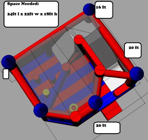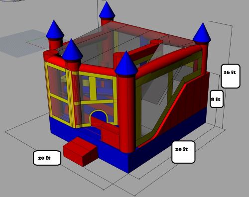 Description: This is our 5 in 1 Extreme combo. It has a mashing net on all of its sides makes it easier for parents to supervise their kids inside. It includes a bouncing area, a climbing and sliding area as well an inflatable basketball hoop inside (we no not provide the mini basketballs for it). Call us now and ask for availability! You will only need a Space required 23W x 24L x 18H feet of clearance space for this standard size jumpy. It's actual size is 20W x 21L x 15H feet. The bounce house holds 8 children from 2-12 years old or 6 from 9-15 years old. It can be set up on grass, asphalt or concrete. We will need a 3-4 feet access clearance and a clear path on the entrance (if the set up is in your backyard). The slide on this item has only one lane. Please make sure it is used properly.