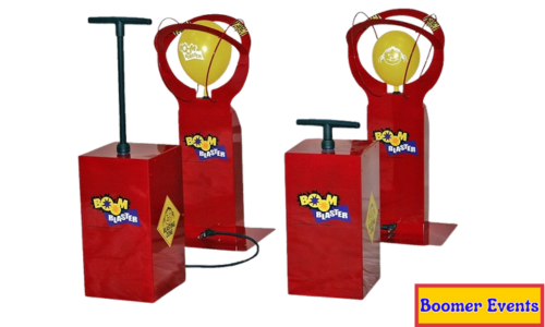 A balloon is placed on the tube of the first piece, which has sharp points on the arcs. As the player pumps the blaster the balloon expands and presses against the sharp points. First player to burst a balloon wins. Each Boom blaster comes with 50 balloons. 1 Blaster = $99, 2 Blasters = $179. Please add $20 for Monday through Friday rentals. Late night pickup (after 8PM) or overnight fees (after 10PM) apply. Additional delivery charges may apply. Colors may vary. ADULT SUPERVISION IS REQUIRED AT ALL TIMES!