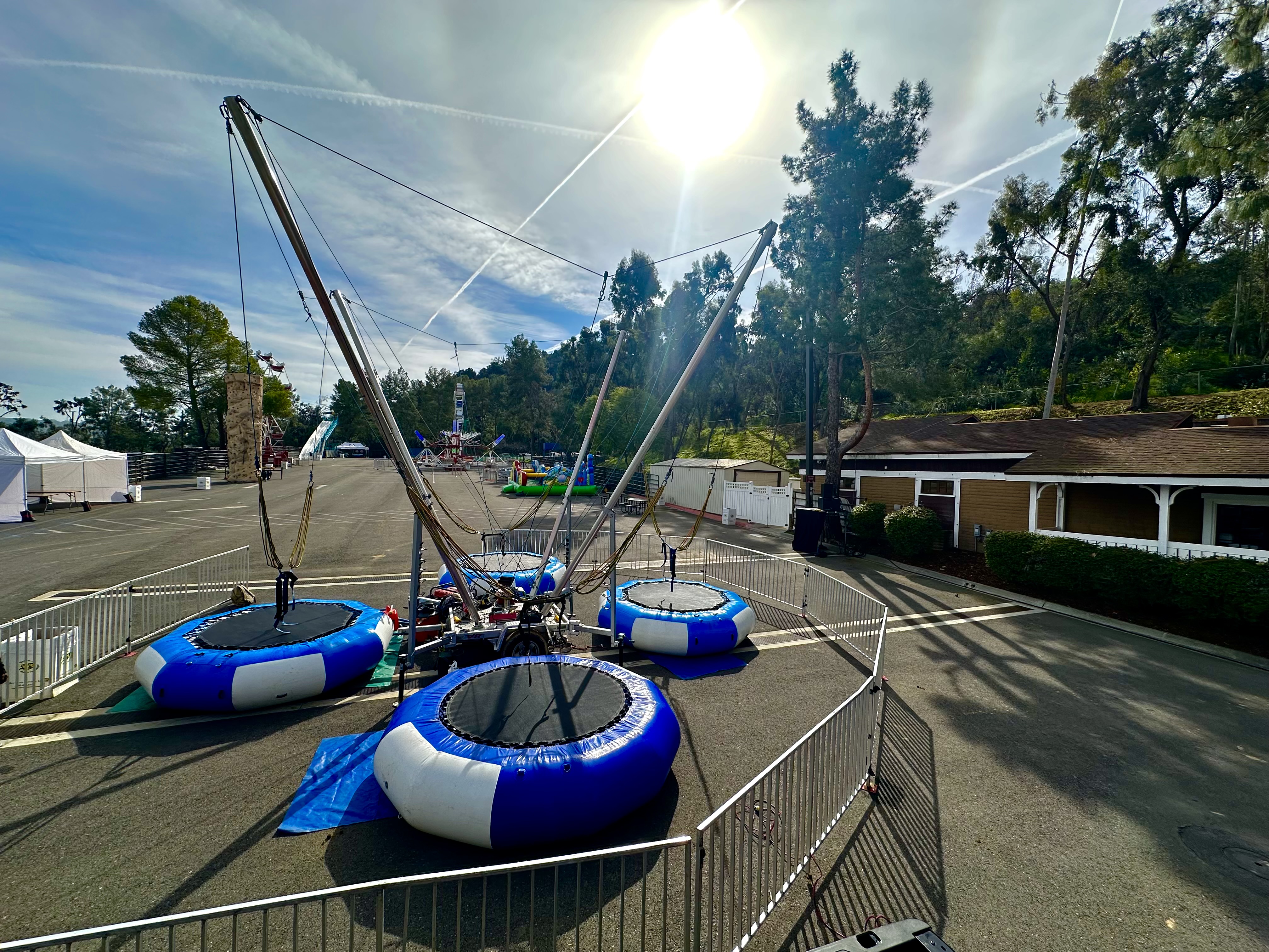 Rent the Bungee Trampoline Quad Pod in Mission Viejo, Long Beach, Tustin, Orange County, the greater Los Angeles area, the Inland Empire and Southern California. The Monkey Motion Quad Pod is Quad Pod Bungee Trampoline rentalgreat for birthday parties, special events, corporate functions and church events. Take on the world on this incredible 4-station Bungy Trampoline! You are attached to the Euro Bungy and the harder you jump, the higher you fly into the air. You can even do spins in the air! This event is great fun, high profile, and can even be a fantastic workout, popular with all age groups. Great for kids as well as adults up to 200lbs. The Bungy Trampoline is sure to bring in a crowd of spectators and participants! Our Quad Pod Trampoline is fully portable, mounted on a trailer for quick, safe and easy set-up. $1,999 price is for three hours and includes two attendants to make your event easy and enjoyable. Electrical plug-in must be within 100' to ensure proper operation. Additional delivery charges may apply. Colors may vary.