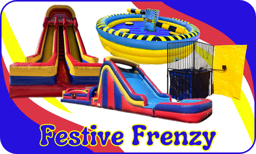 Step into the Spectacle: It's Festive Frenzy Time! Get ready for a whirlwind of excitement with our Festive Frenzy Package, creating an extravaganza like no other that promises to elevate your celebration to new heights! Thrill rides, stomach dropping slides, adventurous obstacle courses and a dunk tank to add some splash! For convenience, this package is customizable and includes one item from each of the four listed categories. Due to high demand, ALL packages must be booked over the phone to guarantee availability Packages are subject to availability of each item. For further assistance, feel free to reach out to us at 805-955-9802
