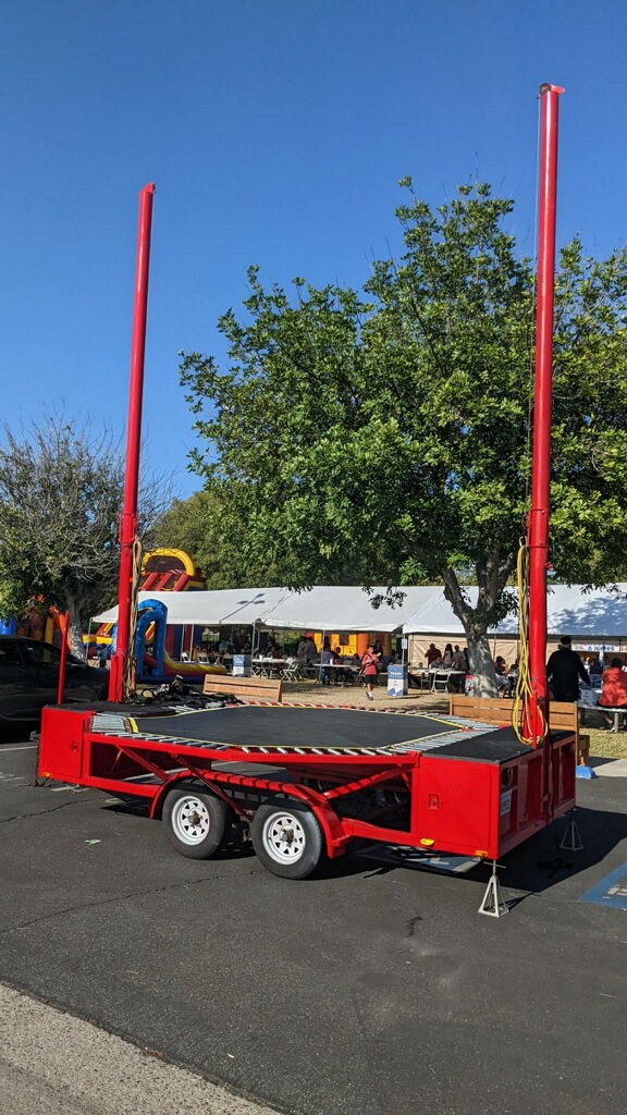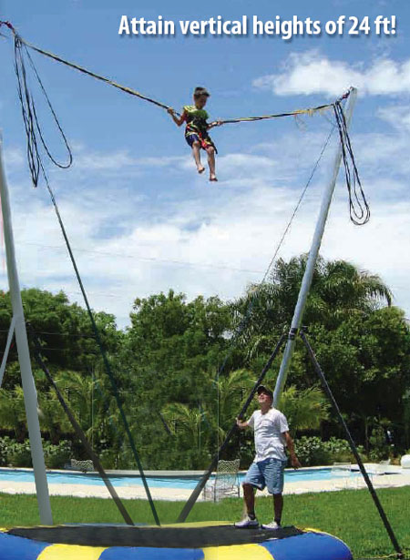 Rent the Bungee Trampoline / Trampoline Thing / Euro Bungy for your next special event, church function, birthday party, corporate event or special event. The Bungee Trampoline / Trampoline Thing / Euro Bungy is available for rent in Orange County, the greater Los Angeles area and Southern California. Take on the world on this incredible Bungee Trampoline! You are attached to the Trampoline Thing by bungee cords, and the higher you jump, the higher the bungee cords whip you into the air. You can even do spins 20 feet up in the air! This event is great fun, high profile, and can even be a fantastic workout, popular with all age groups. The Bungee Trampoline is sure to bring in a crowd of spectators and participants! Our standard Bungee Trampoline Thing is fully portable, mounted on a trailer for a quick, safe and easy set-up. WE ARE INSURED!!! CALL US FOR AVAILABILITY AND PRICING 805-955-9802 |