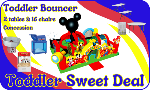 TODDLER SWEET PACK Enjoy this awesome toddler package! Get a toddler combo, two tables, sixteen chairs and a concession machine for a bundle deal. For the combo, you can choose between the following combos: Please keep in mind this bundle package is subject to the availability of each combo. Call us if you have any questions 805-955-9802 For the concession machine, you can choose between the snow cone machine, cotton candy or popcorn machine. Any of these options includes the first 50 servings. We don't provide the ice for the snow cone machine. |